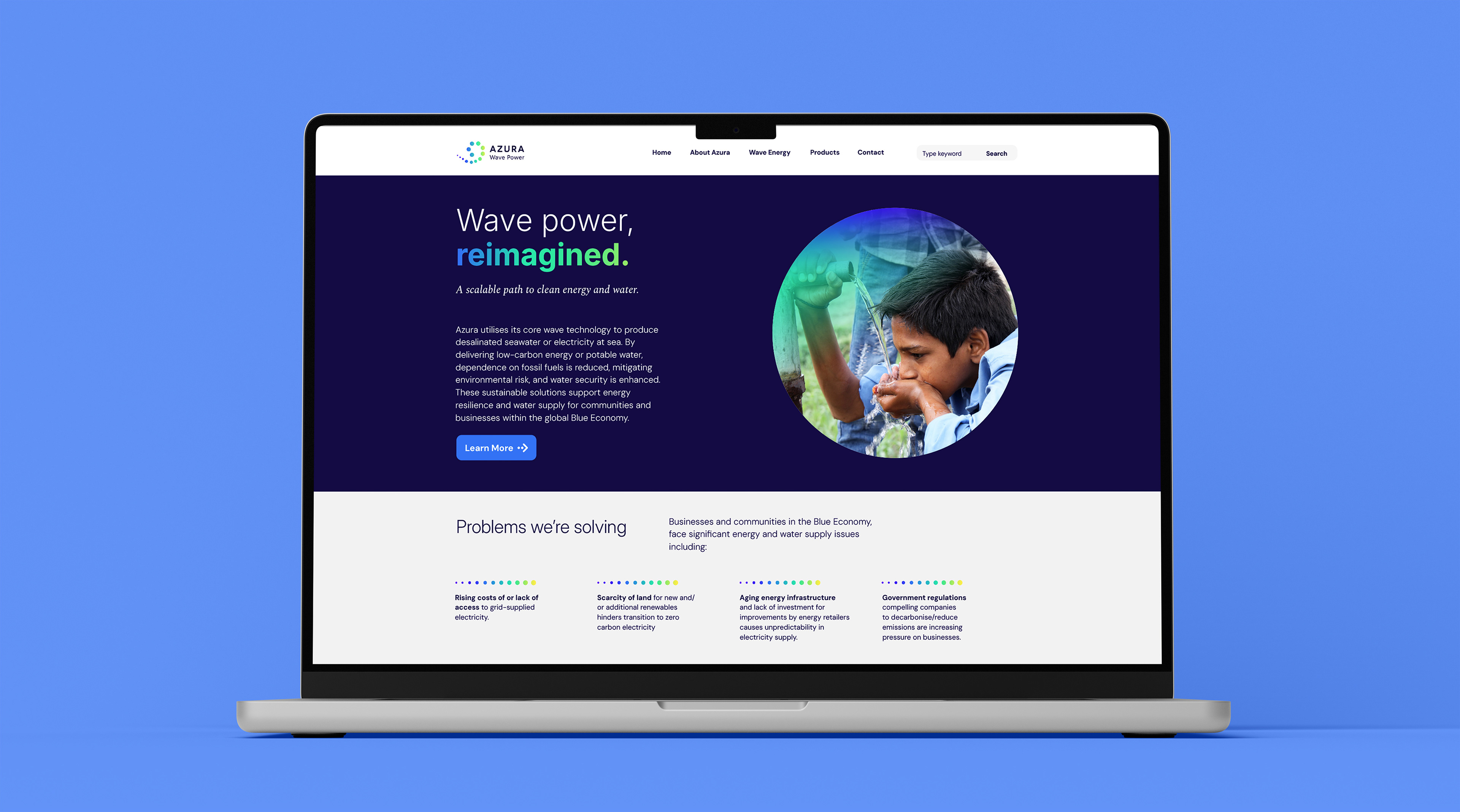 Azura Wave Power focusses on delivering sustainable power and water from the sea by building wave energy devices that Blue Economy businesses and communities with low-carbon electricity and desalinated water. We were asked to modernise their logo and develop a visual identity to bring their vision alive.