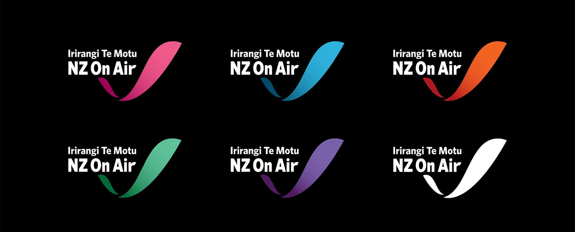 The first change was an update to the organisation’s logo — it was about 12 years since the last full update. The English and Te Reo names were given equal weighting. The biggest shift was moving away from the previous identity’s full spectrum of rainbow colours in the logo to a more punchy colour palette. The logo could be rendered in any colour from this palette as a solid colour, providing much greater flexibility to differentiate NZ On Air’s individual areas of activity and sub-brands.